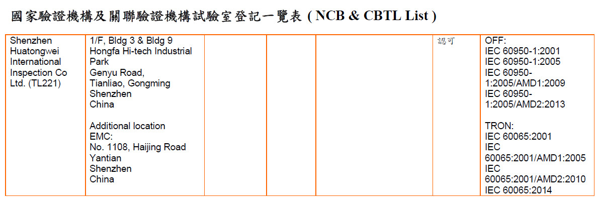 On January 11, 2019, Shenzhen Huatongwei Laboratory successfully completed the registration of Taiwan BSMI and became the CBTL approved by BSMI. The scope of authorization includes safety standards IEC60950-1 and IEC60065.