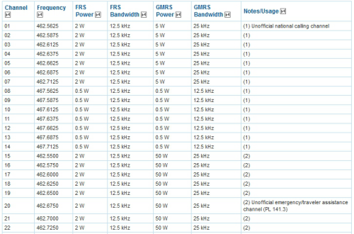 2. 新版规定FRS可以支持22信道,而旧的FRS只能支持14个信道,具体参数变动如下表: