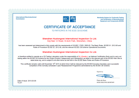 2013年3月,华通威顺利通过CBTL复评审和扩项评审,CBTL资质证书获得了更新。本次评审在原有IEC60950标准下,又扩充了IEC60065标准,进一步显示了华通威的检测认证实力,可以更好的为广大IT、AV 产品客户提供CB国际认证服务。