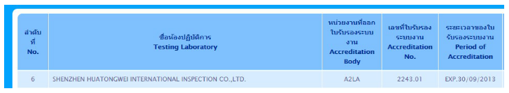 2013年6月,华通威实验室凭借其先进的测试设备和完善的检测质量管理体系,成功获得泰国国家广播和通信委员会(简称NBTC)认可资质。