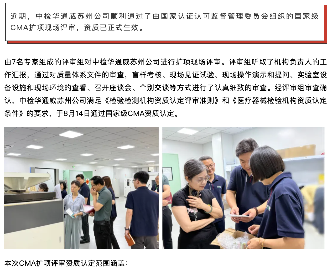 中检华通威苏州公司顺利通过国家级CMA现场扩项评审
