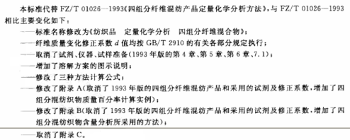 Z/T 01026-93 《四组分纤维混纺产品定量化学分析方法》是1993年发布实施的关于四组分纺织纤维混纺和交织产品的含量分析方法,填补了当时 GB 2910 《二组分纤维混纺产品定量化学分析方法》与GB 2911 《三组分纤维混纺产品定量化学析方法》的方法空白。该方法定义了四组分纤维混纺产品中不同的溶解方案以及相应的计算公式,并且将常见纤维组合一一举例并给出相应溶解试剂及修正系数。