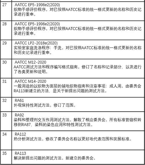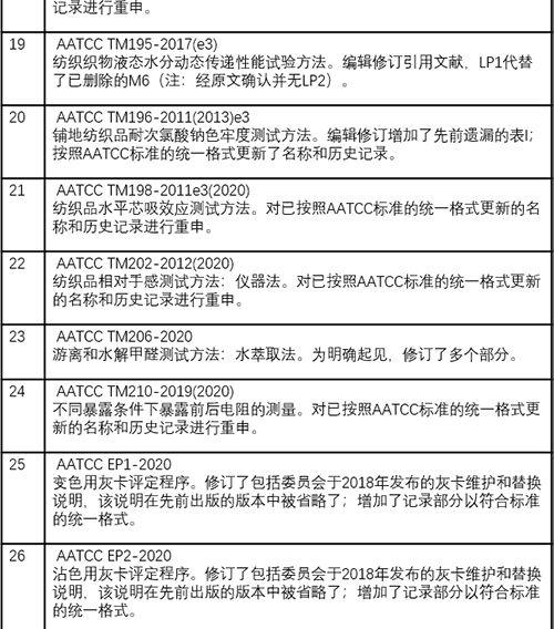 目前,基于2020年AATCC技术手册的修订和重审已经通过一致审议且公布。其中,自2021 AATCC第96卷开始,原AATCC技术手册更名为AATCC国际试验方法和程序手册。