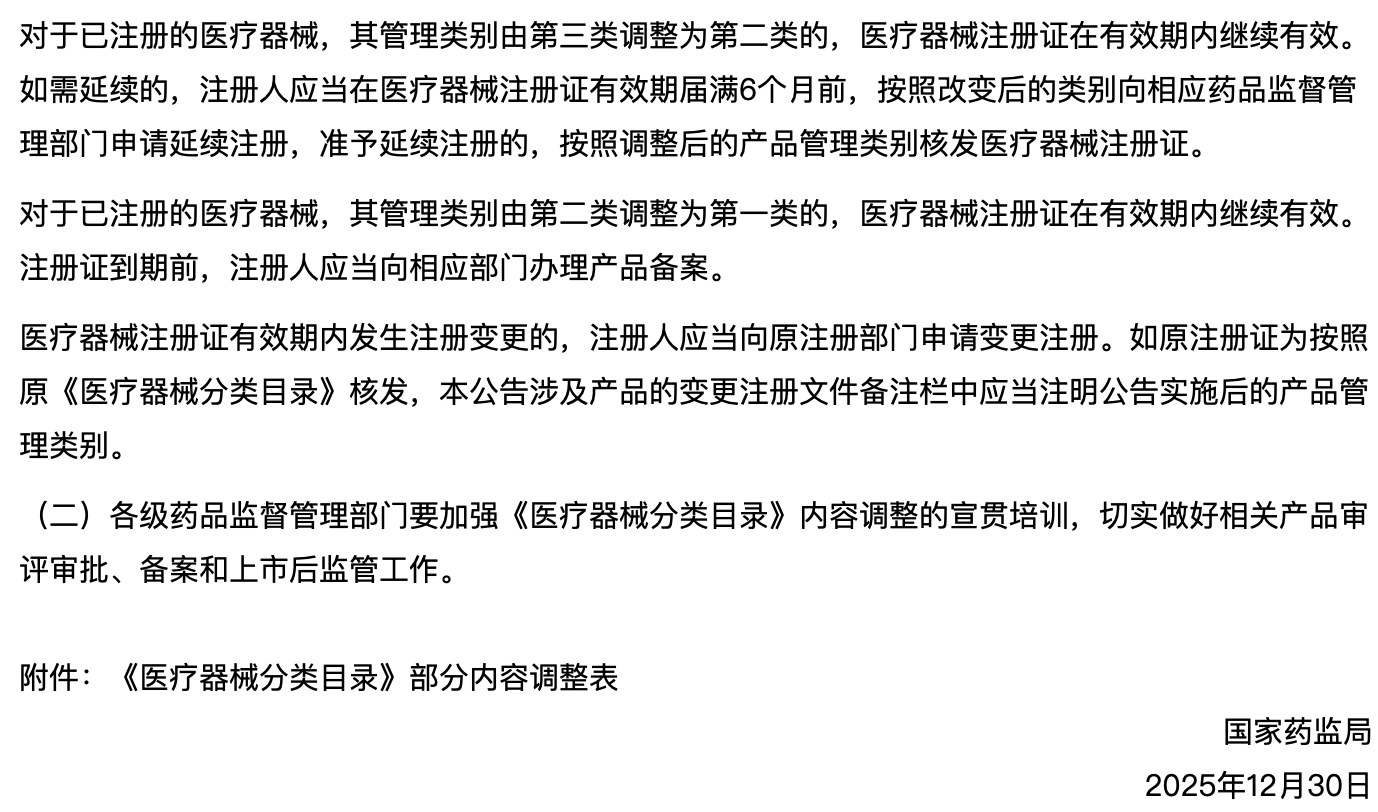 国家药监局关于调整《医疗器械分类目录》部分内容的公告