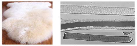 绵羊毛呈自然蜷曲,山羊毛皮的粗羊毛和山羊绒粗细明显。