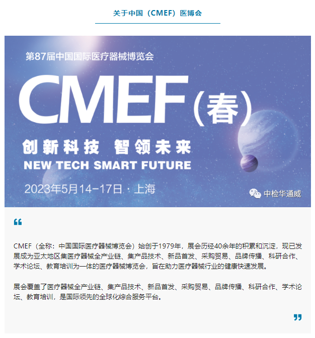 【诚邀】中检华通威与您相约CMEF2023第87届中国国际医疗器械(上海)博览会