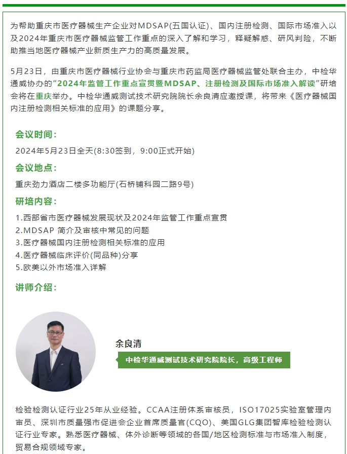 诚邀丨2024 重庆 监管工作重点宣贯暨 MDSAP、注册检测及国际市场准入解读研培会