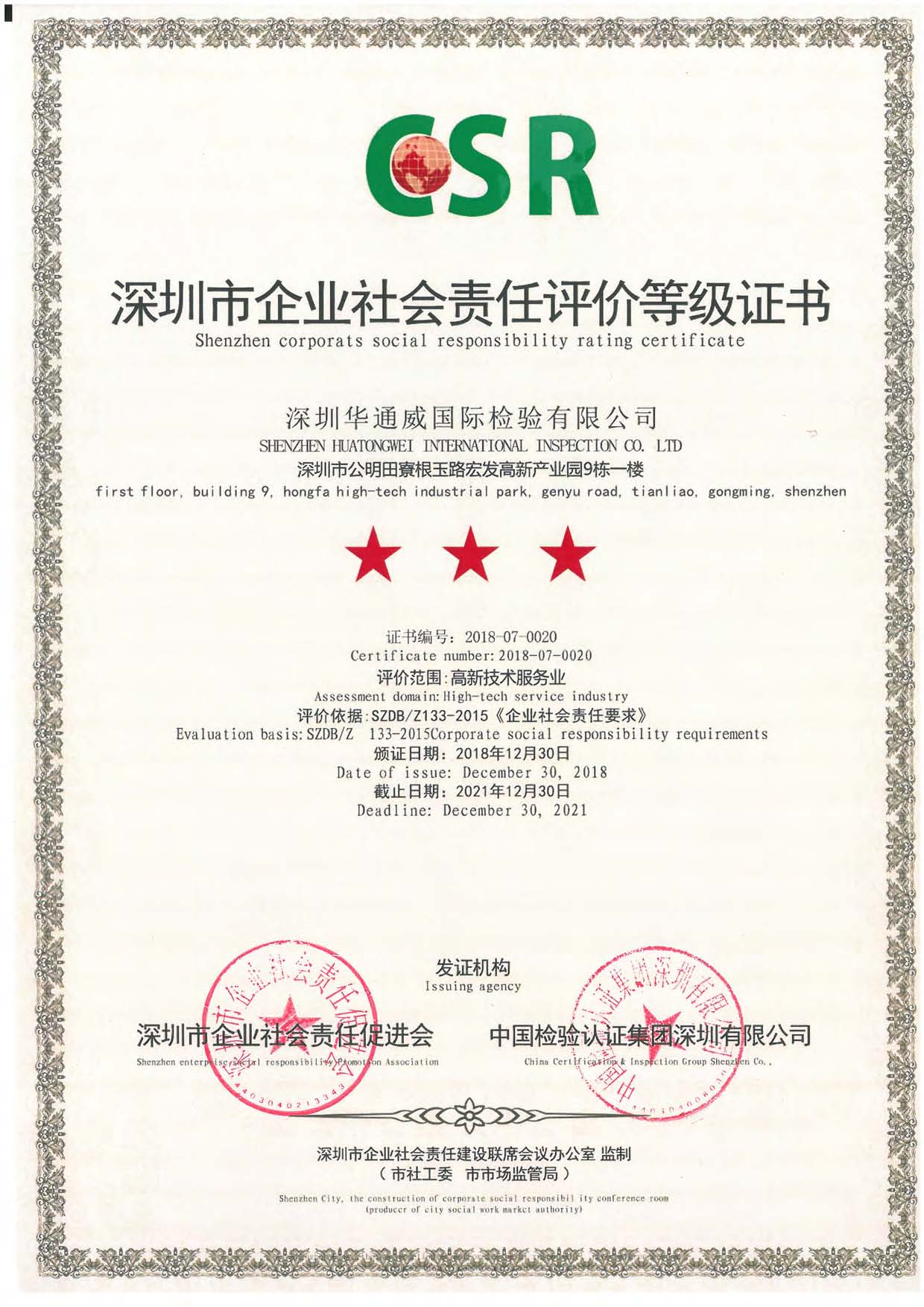 深圳市企业社会责任等级证书